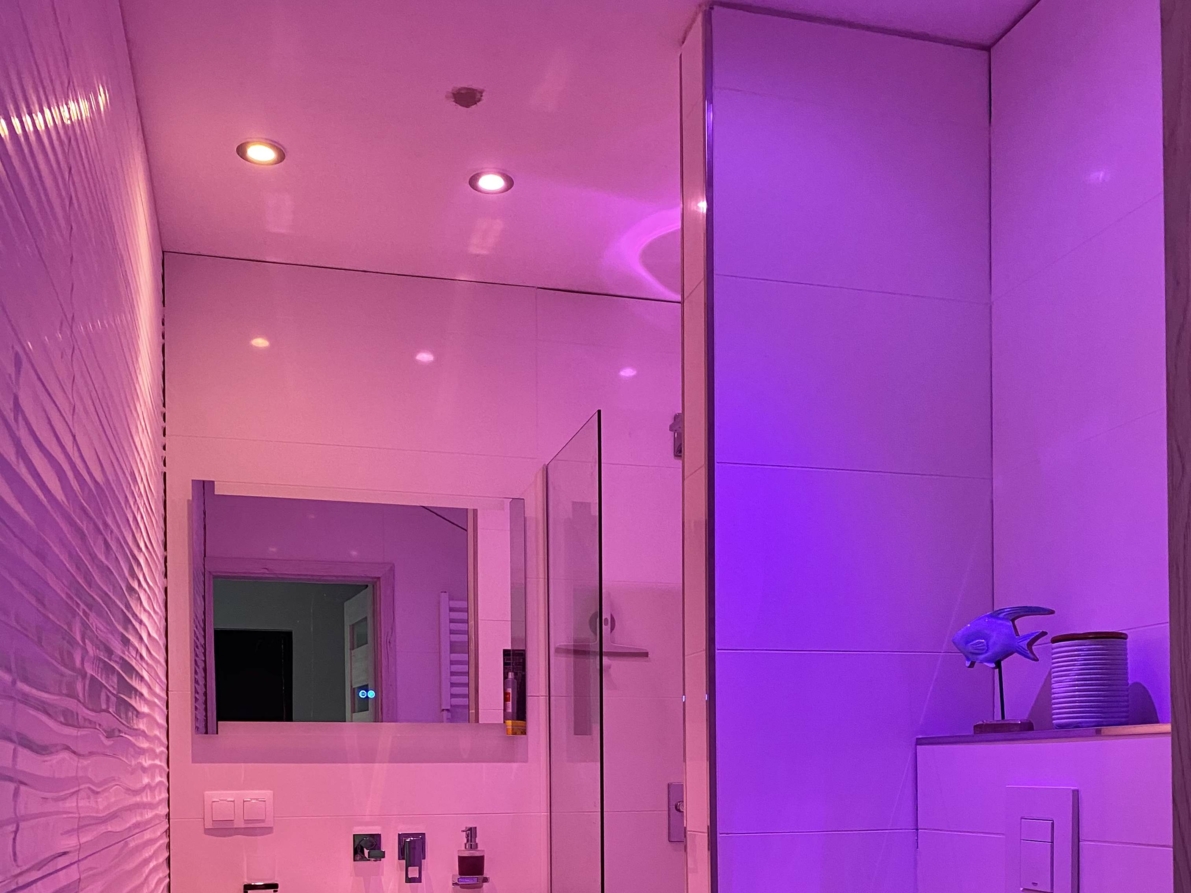Łazienka domu znajduje się na parterze. Imponuje wizualnie prostą elegancją, ale jest również bardzo nowoczesny i wyposażony w najnowszą technologię. Oprócz prysznica wrażeń z różnymi funkcjami i ustawieniami, pod którymi można naprawdę dobrze się bawić, możesz cieszyć się ciepłymi stopami po wyjściu z prysznica, ponieważ możesz wcześniej podgrzać podłogę za pomocą zdalnie sterowanej podłogi ogrzewanie. Dodatkowo, jak we wszystkich innych pokojach, znajdziesz system oświetlenia, dzięki któremu możesz poczuć się naprawdę komfortowo, w zależności od nastroju i preferencji kolorystycznych. Stylowa umywalka, toaleta, nowoczesny podgrzewany wieszak na ręczniki i dużo miejsca do przechowywania uzupełniają koncepcję łazienki.